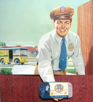 By 1963, Helms 800 trucks drove a total of 75,000 miles a day (this equals the distance of 3 times around the world every day). Helms set their record for stops at 250,000 per week. Plenty of folks remember how the driver, called “the Helmsman,” handed out broken cookies and day-old donuts to neighborhood kids along his route while mothers bought fresh loaves of bread, pastries, cream puffs, pies and other baked delicacies. The trucks were famous as far north as Central California all the way south to the Mexican border. As they slowly traveled down neighborhood streets they would blow their well-recognized Helm’s whistle and children and house wives would run to the trucks. Today the whistles are very rare and almost impossible to locate. Drivers stacked crates of bread loaves up front and used the drawers mostly for pastries. Helms wanted people to get in the truck, yank out the drawers and look at the stuff, and say, here’s what I want. It was not just a delivery. It was a selling tool for Helms.